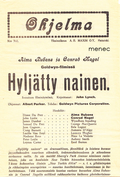 Kustantaja: Maxim, Helsinki Paino: 10 grammaa Asu: n. 15x40 cm Painovuosi: 1925 Kunto: K3 Alma Rubens ja Conrad Nagel, Goldwyn Hakusanat: elokuva Helsinki julisteet Tuotenumero: 113944 Lisää ostoskoriin