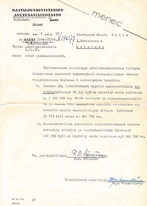 Professori Heikki Wariksen saama tiedonanto Maatalousministeriön asutusasiainosastolta 4.5 €