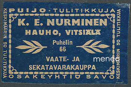 Kauppiasetiketti, K. E. Nurminen, Hauho, Vitsiälä 2.5 €