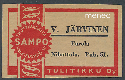 Kustantaja: Tulitikku Oy Paino: 5 grammaa Sarja: Sampo Kunto: K4 Hakusanat: tulitikkuetiketit paikallishistoria Tuotenumero: 161378 Lisää ostoskoriin