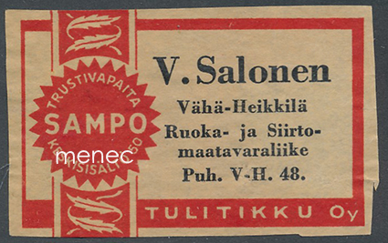 Kustantaja: Tulitikku Oy Paino: 5 grammaa Sarja: Sampo Kunto: K4 Hakusanat: tulitikkuetiketit paikallishistoria Tuotenumero: 162103 Lisää ostoskoriin