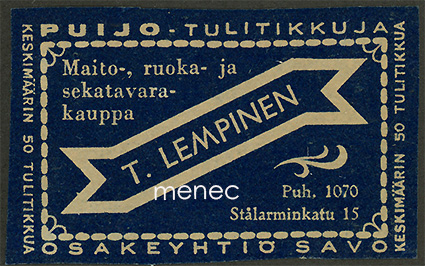 Kustantaja: Oy Savo Paino: 5 grammaa Sarja: Puijo Kunto: K4 Stålarminkatu 15 Hakusanat: paikallishistoria tulitikkuetiketit Tuotenumero: 175218 Lisää ostoskoriin