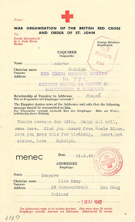 Punaisen Ristin sotaorganisaation välittämä viesti omaisille 1942; sensuurileima 35 €