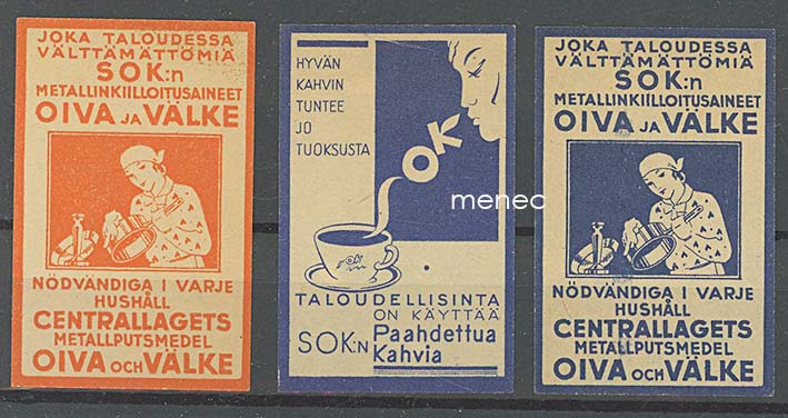Tulitikkuetikettejä, metallinkiilloitusainetta ja paahdettua kahvia, 3 kpl. Oiva ja Välke 14 €