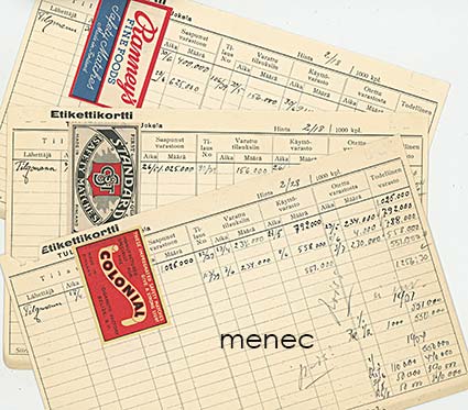 Vientietikettejä, 3 kpl, inventointi- ja tilaustietokortti 4 €