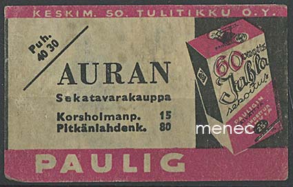 Kustantaja: Tulitikku Oy Paino: 5 grammaa Kunto: K2 Hakusanat: ruoka, nautintoaineet tulitikkuetiketit Helsinki Tuotenumero: 218188 Lisää ostoskoriin