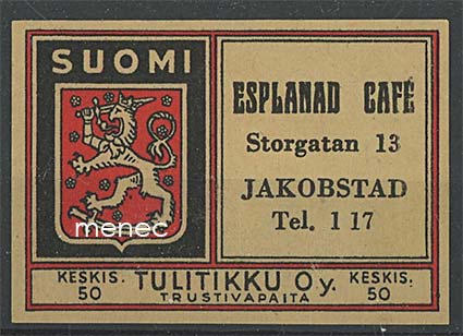 Tulitikkuetiketti, Esplanad Café, Pietarsaari 3 €