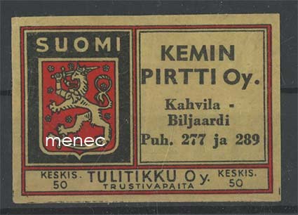 Tulitikkuetiketti, Kemin Pirtti Oy. Kahvila - Biljaardi 3,00 €