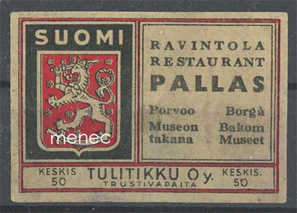 Tulitikkuetiketti, Ravintola Pallas, Porvoo 2,00 €