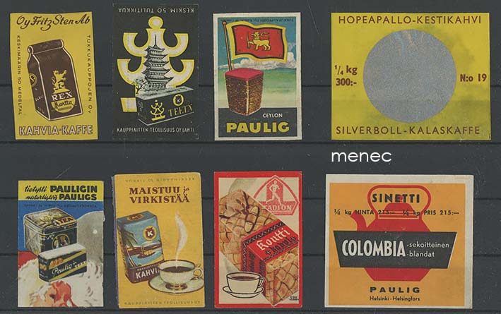 Tulitikkuetikettejä, kahvi ja tee, 8 kpl 5 €