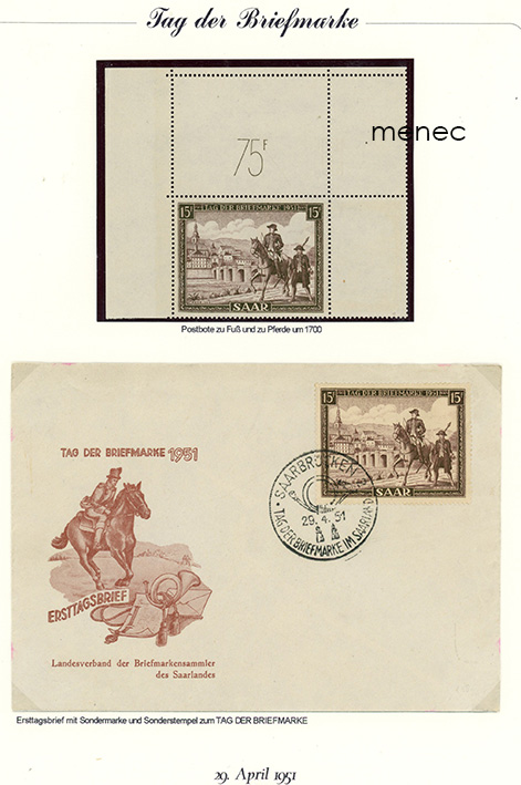 Saksa, Saarland, Postimerkin päivä 1951, FDC-teemakuori ja arkin reunapala