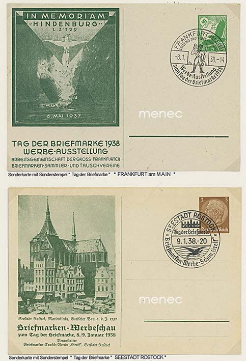 Saksa, Postimerkin päivä 1938, Hindenburgin Lakehurst-onnettomuuden muistokortti lentopostiehiöllä ja Seestadt Rostock-ehiöllä