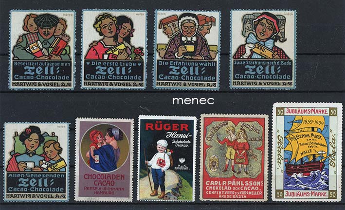 Eurooppalaisia mainosmerkkejä, suklaata ja kaakaota, 9 kpl