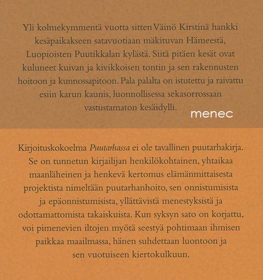 Kustantaja: Tammi Paksuus: 3 cm Paino: 420 grammaa Asu: Skp Painovuosi: 2003, 1. painos Kunto: K4 Sivumäärä: 265 Hakusanat: kaunokirjallisuus, kotim.