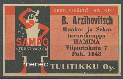 Seppä-tulitikkuetiketti, B. Arzihovitsch, Hamina. Ruoka- ja sekatavarakauppa 2.5 €