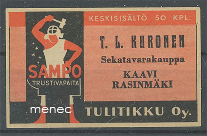 Kustantaja: Tulitikku Oy Paino: 5 grammaa Sarja: Sampo Kunto: K4 Hakusanat: tulitikkuetiketit paikallishistoria Tuotenumero: 229885 Lisää ostoskoriin